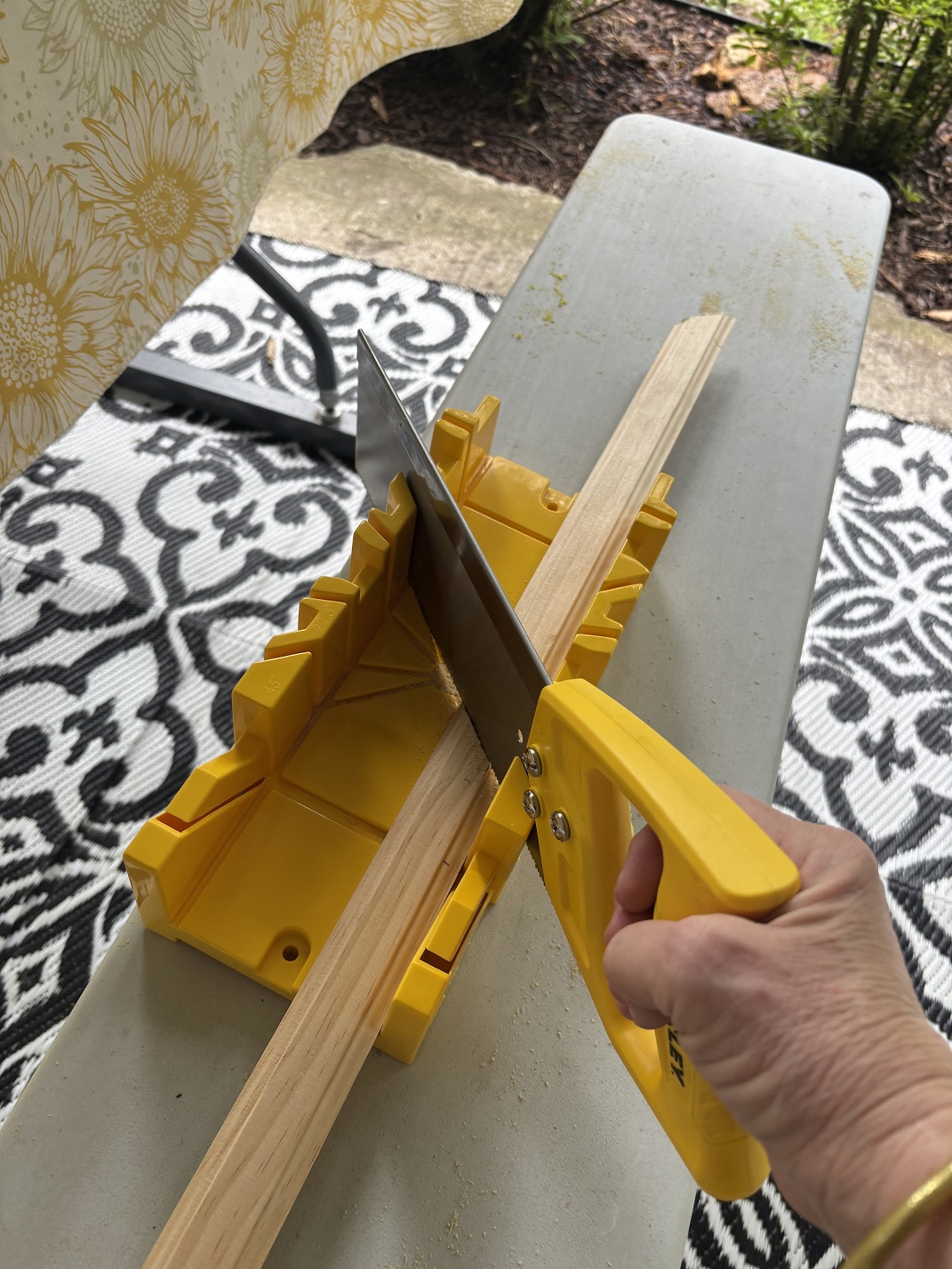 Set your miter saw (or miter box) to 45°. Here’s the trick: place your blade right on the line you marked, not beside it, so you don’t lose precious millimeters. I cut two 16” lengths and two 26” lengths.